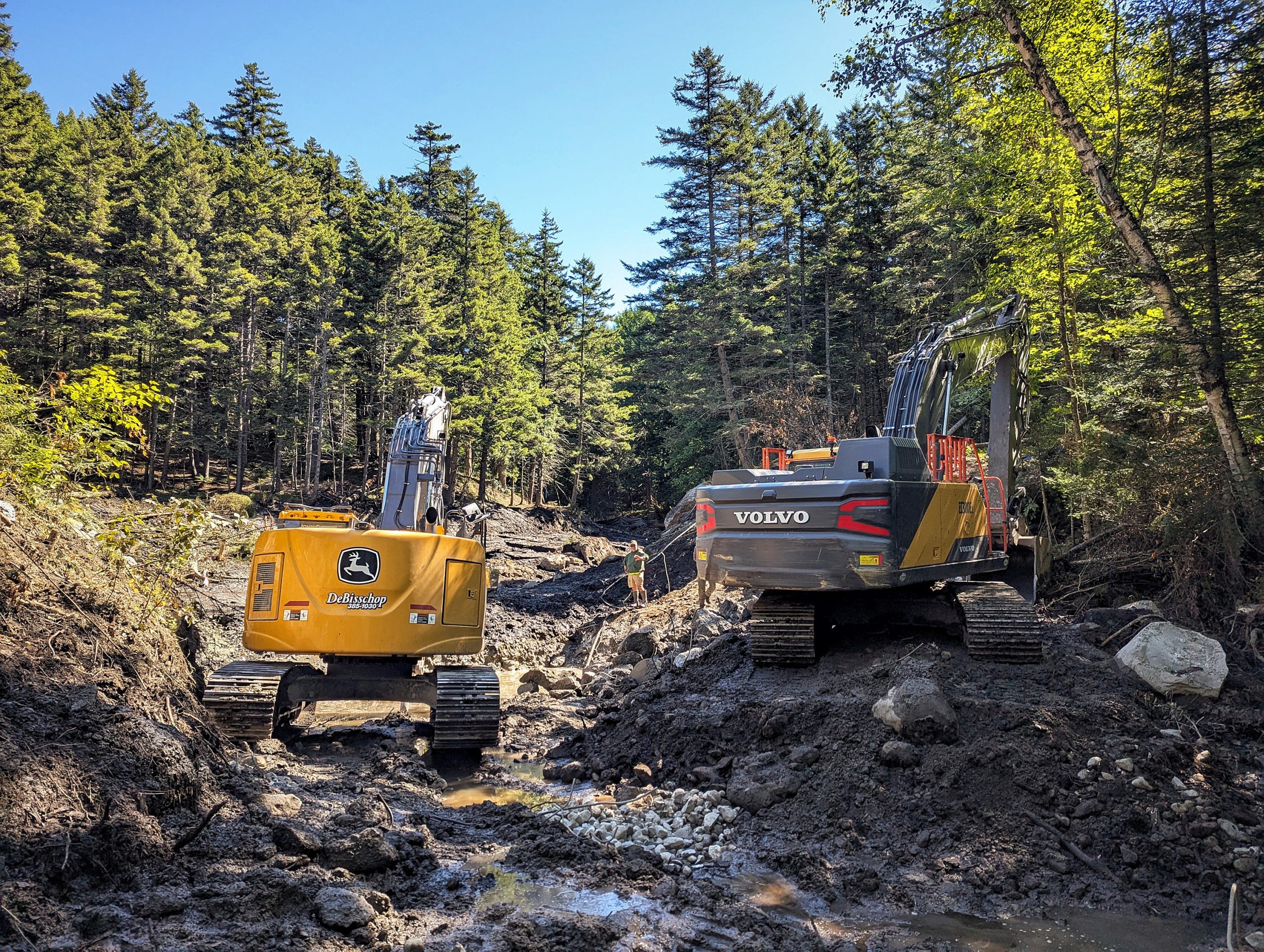 In August of 2025 the Breadloaf Dam along Brandy Brook in Ripton, VT was successfully removed. This project was managed by VNRC in partnership with the landowners, Middlebury College, the engineers SLR Consulting, and the Goodhue Excavating. The Breadloaf Dam was constructed in 1937 as a water supply reservoir for Middlebury College’s Breadloaf Campus. VNRC and partners were able to use the original blueprints for the dam in order to infer the natural topography of the Brandy Brook and its floodplain prior to dam construction, which informed restoration design plans. The removal of this 175 foot long and 25 foot high concrete dam reconnected 3 miles of high-quality brook trout habitat and reconnected the Brandy Brook back to the Middlebury River.